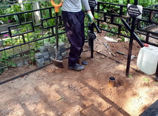 Приехав вновь на кладбище, мы взялись за очистку места захоронения от посторонних элементов: срезали болгаркой старое ограждение; пропололи сорную траву, а также разровняли землю, готовя её к покрытию бетонной плиткой.